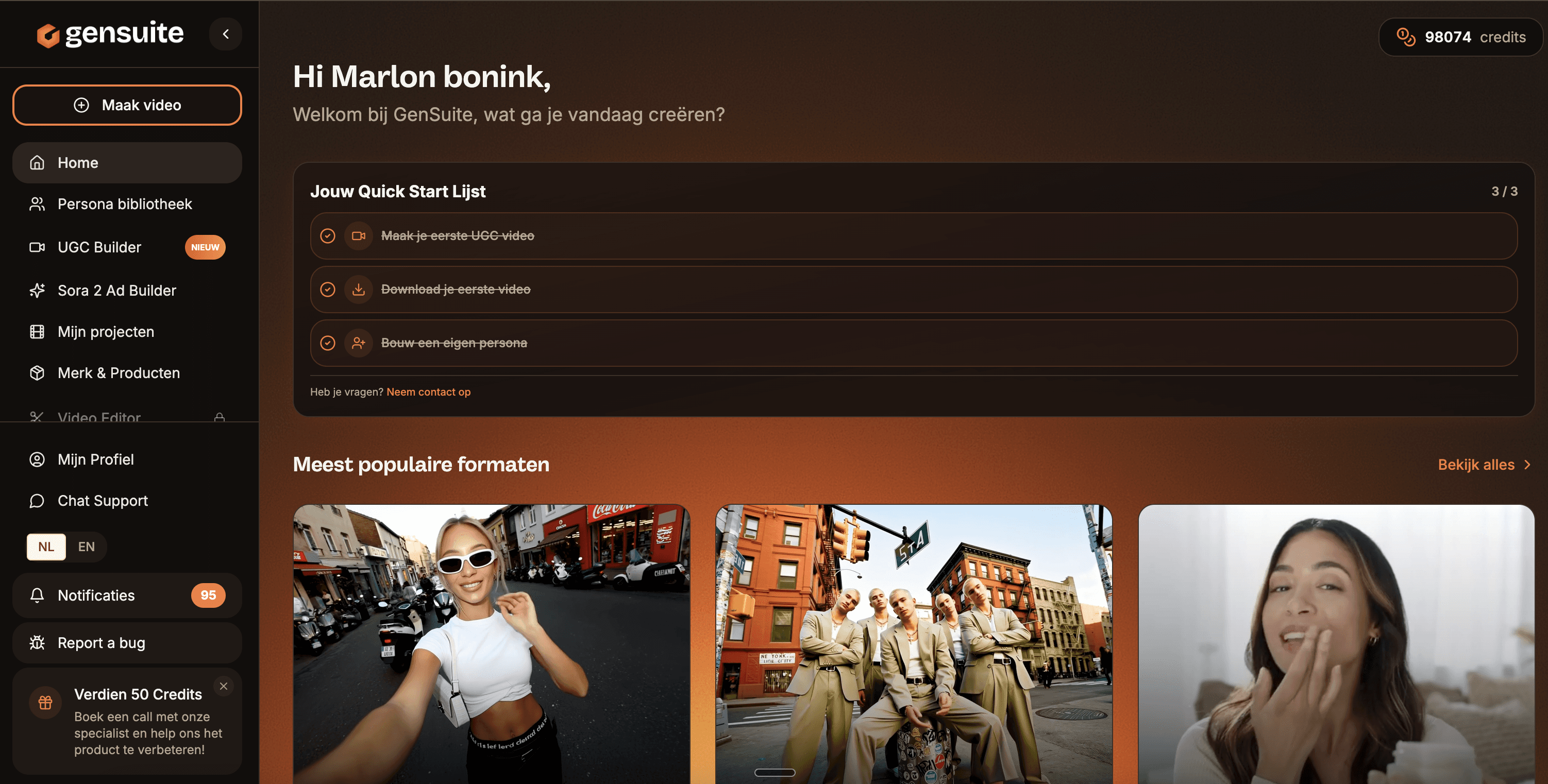 Na registratie krijg je direct toegang tot alle tools van GenSuite. Kies een van onze AI personas uit de bibliotheek, upload je product, en genereer binnen enkele minuten je eerste professionele UGC video. Onze intuïtieve interface maakt het eenvoudig om meteen te beginnen, zonder technische kennis.